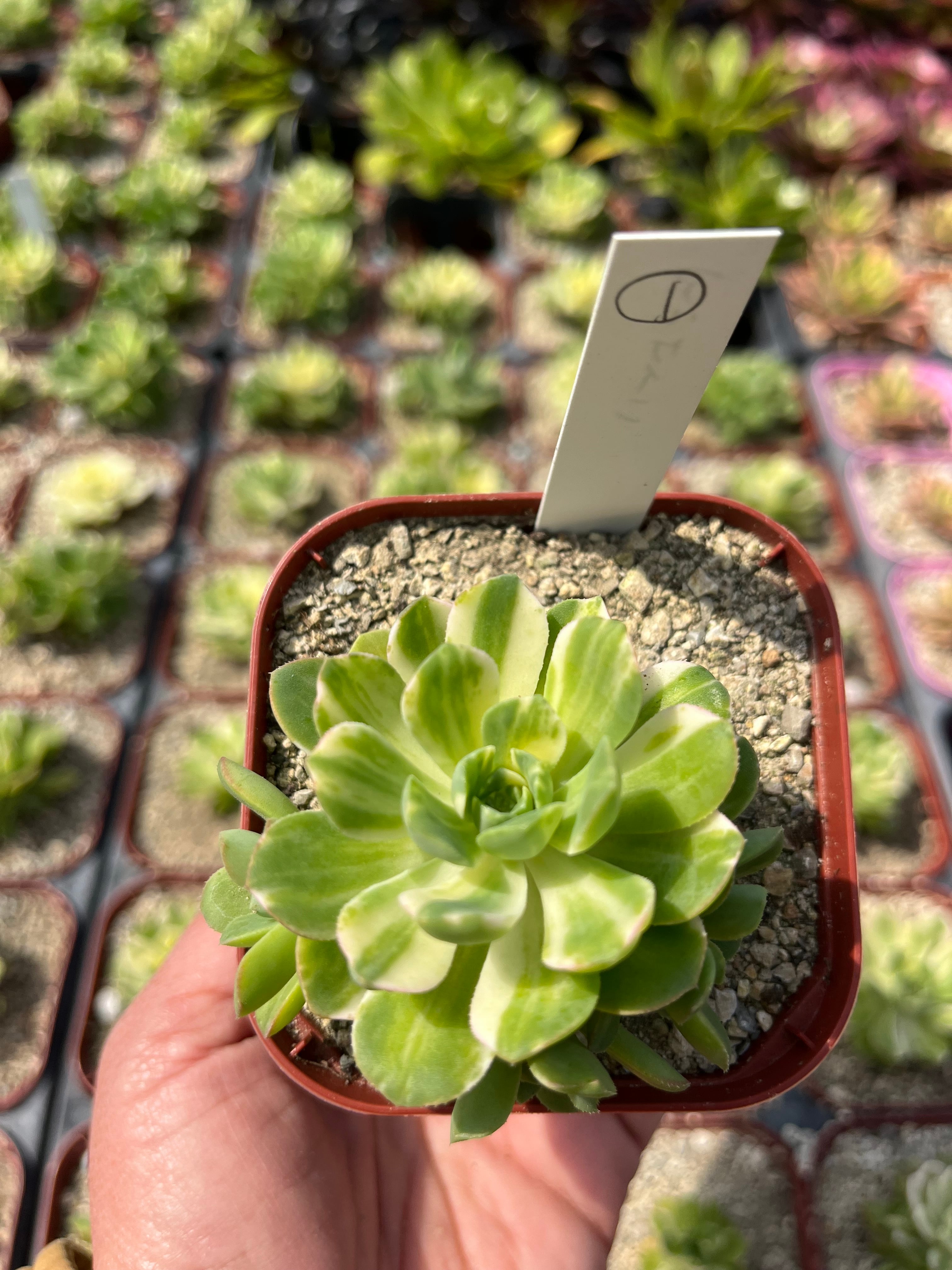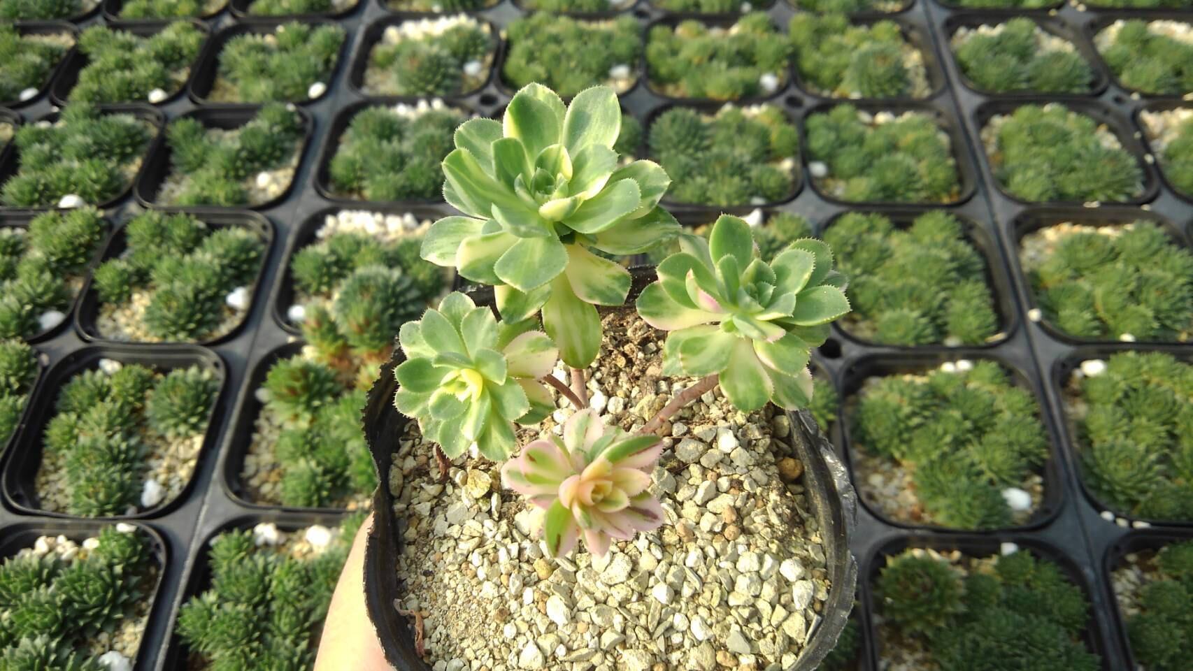 フイリのかわいらしいアエオニウムです。で 6月は休眠期です。 霜には気をつけて、軒下で管理してください。 雪も被ると枯れます。 9センチポットに植えてあります。 日々、変化、成長します。 ご了承下さい。