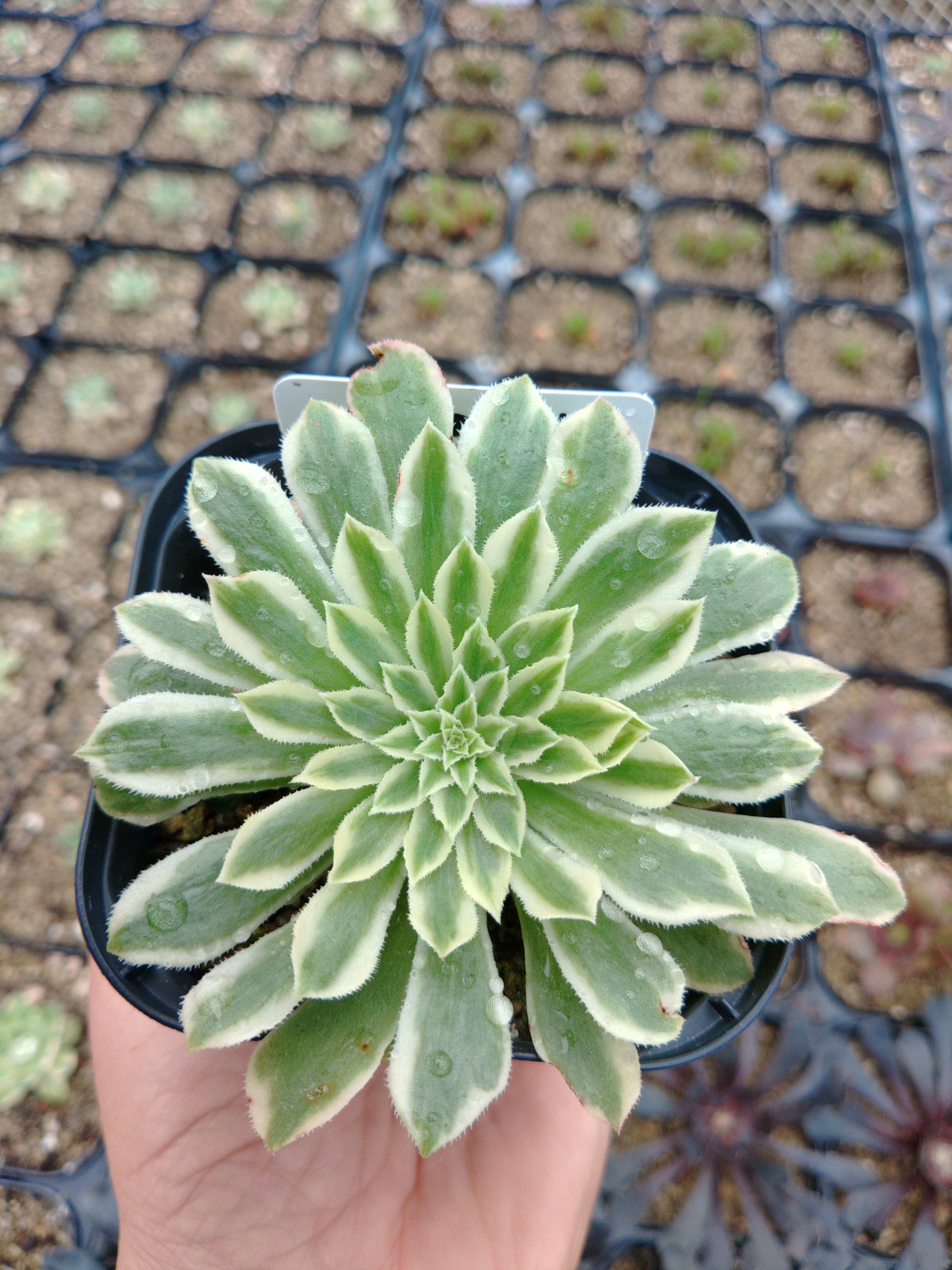 9センチポットに植えてあります。 夏の直射はお気をつけ下さい。 日々、変化、成長します。ご了承下さい。 1月現在、子供は吹いていません。 1枚目の写真です。