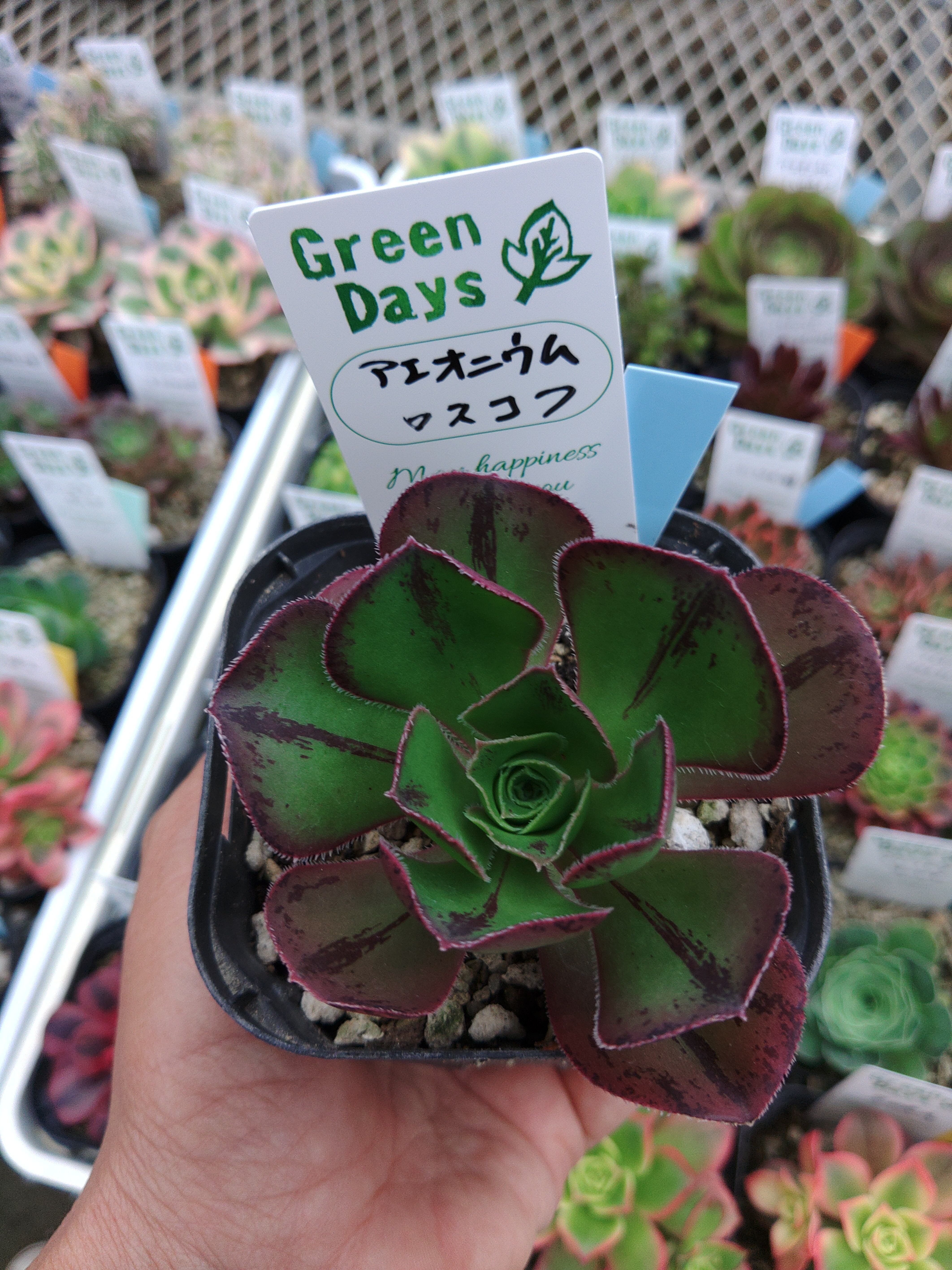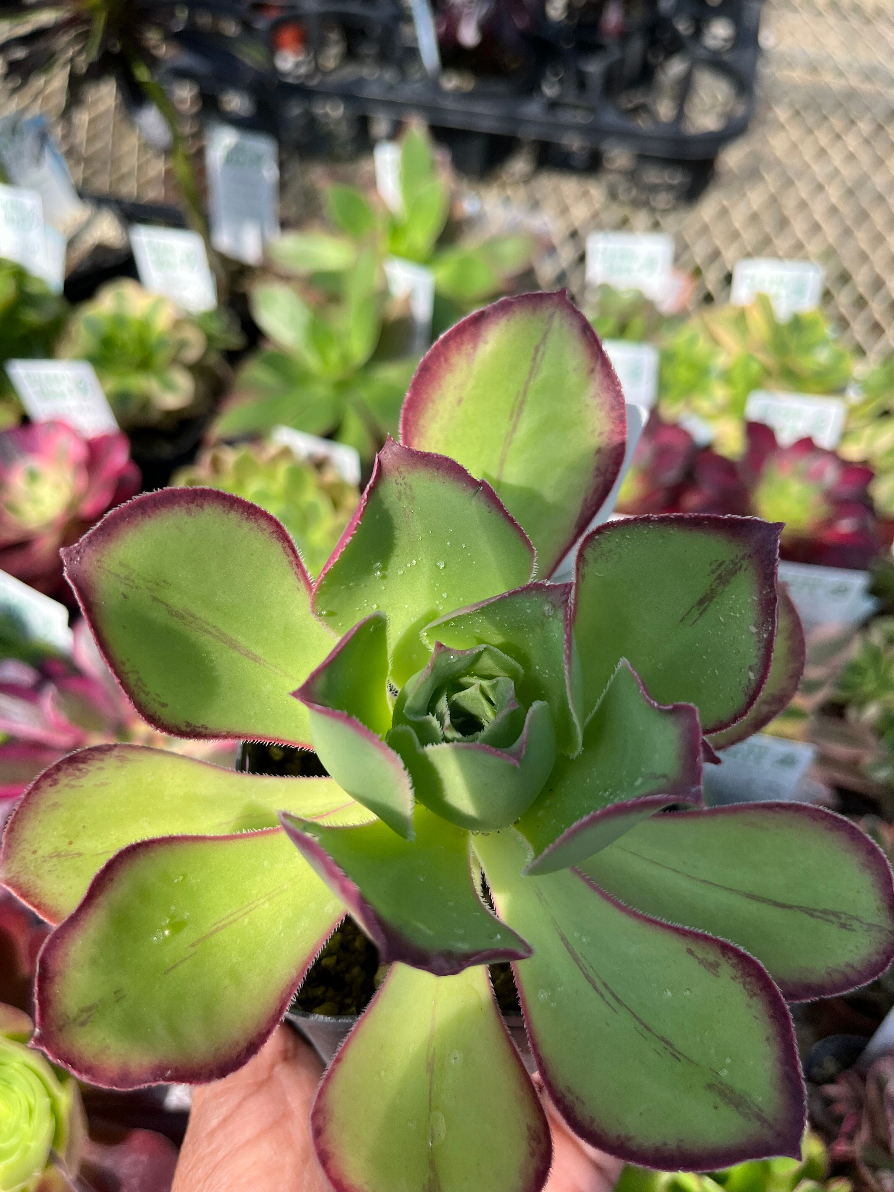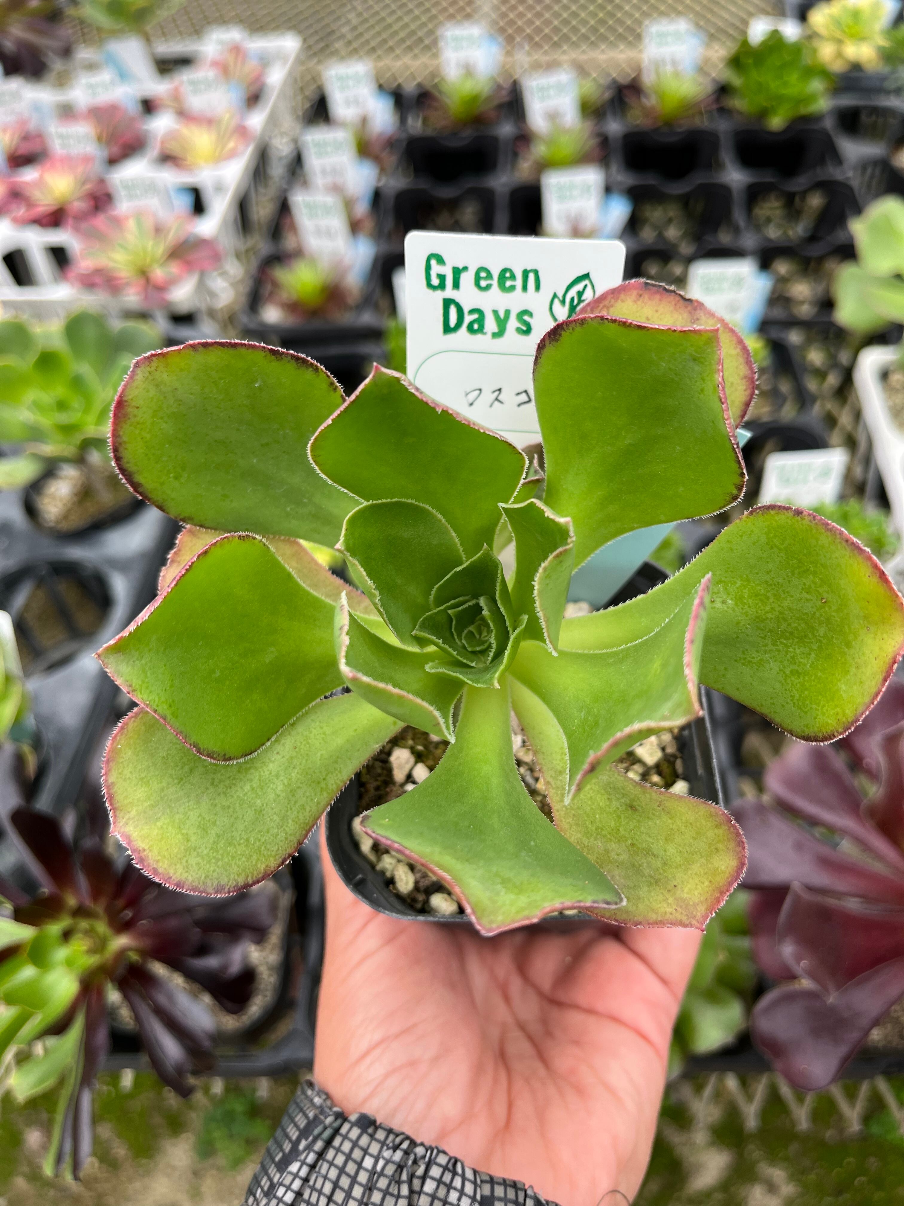 9センチポットに植えてあります。 日々、変化、成長します。 ご了承下さい。 休眠期近くになると縁取りが赤くなりバラっぽくまとまりかわいいです。 小さくコンパクトに育てるとかわいいかなと思います。 基本的に大きくなる品種です。